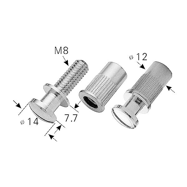 Set of 2 height adjustment thumbwheel posts for mounting various tailpieces including the Wrap Around style. Set includes 2 Posts, and also 2 Anchor Bushings for the body of your guitar. The "Round Top" 14mm wide head adjusts with a flat head screwdriver. These are an M8 Metric Thread, and the bushing requires a 12mm hole.